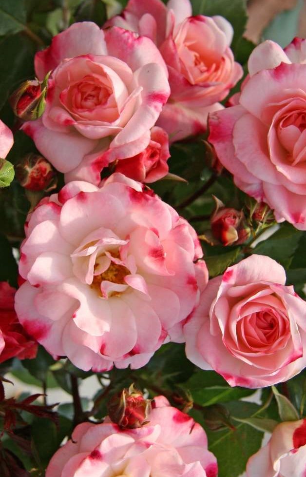 Rosenstadt Freising  (Kordes, 2003) Описание сорта: Цветки махровые, диаметром до 7 см, с нежным ароматом. Очень необычной и красивой окраски с впечатляющими переливами цветов — по мере распускания на белых цветках с красными подпалинами на краях лепестков появляются розовые потеки и красные штрихи. Цветение — обильное .Куст прямостоячий, ветвистый, высотой до 120 см, с густой, тёмно-зелёной, глянцевой листвой, очень устойчивой к заболеваниям. Цветение — обильное, листва — тёмно-зеленая, густая и очень блестящая.